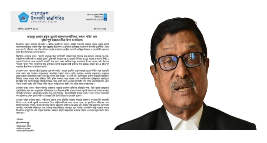 বিএনপির চেয়ারপারসনের উপদেষ্টা ও নিষিদ্ধ ছাত্রলীগের সাবেক কেন্দ্রীয় সভাপতি ফজলুর রহমান কর্তৃক জুলাই আন্দোলনকারীদের ‘কালো শক্তি’ বলে মন্তব্যের তীব্র নিন্দা ও প্রতিবাদ জানিয়েছে বাংলাদেশ ইসলামী ছাত্রশিবির।