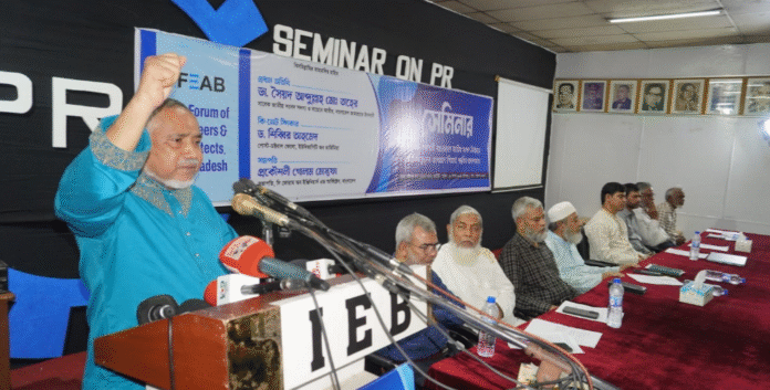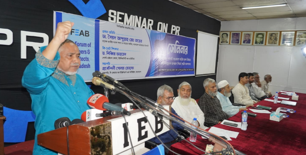 দি ফোরাম অব ইঞ্জিনিয়ার্স অ্যান্ড আর্কিটেক্টস, বাংলাদেশ (এফইএবি)-এর উদ্যোগে ২৪ আগস্ট রাজধানীর ইঞ্জিনিয়ার্স ইনস্টিটিউশন, বাংলাদেশ-এর সেমিনার হলে অনুষ্ঠিত ‘অভ্যুত্থান-পরবর্তী বাংলাদেশে জাতীয় সংসদ নির্বাচনে প্রতিনিধিত্বমূলক অংশগ্রহণ (পিআর) পদ্ধতির আবশ্যকতা’ শীর্ষক সেমিনারে প্রধান অতিথির বক্তব্য রাখেন বাংলাদেশ জামায়াতে ইসলামীর নায়েবে আমীর ও সাবেক সংসদ সদস্য ডা. সৈয়দ আব্দুল্লাহ মোহাম্মাদ তাহের।