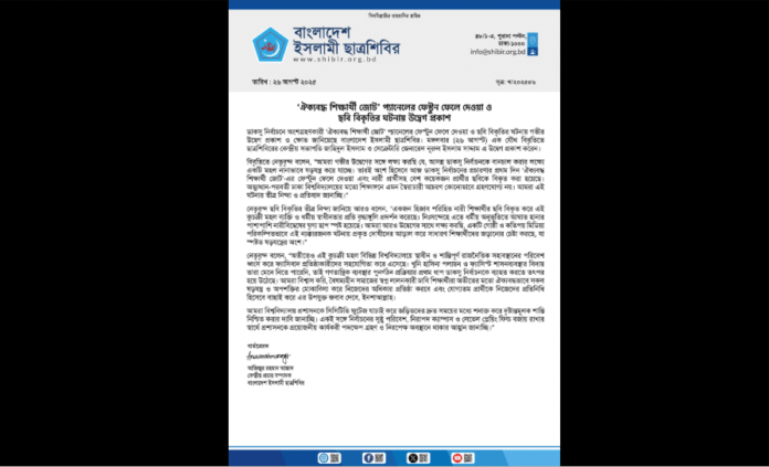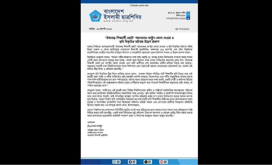 ডাকসু নির্বাচনে অংশগ্রহণকারী ‘ঐক্যবদ্ধ শিক্ষার্থী জোট’ প্যানেলের ফেস্টুন ফেলে দেওয়া ও প্রার্থীদের ছবি বিকৃতির ঘটনায় গভীর উদ্বেগ ও ক্ষোভ প্রকাশ করেছে বাংলাদেশ ইসলামী ছাত্রশিবির।