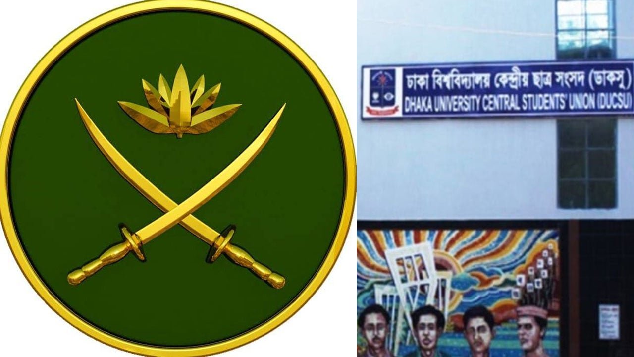 বাংলাদেশ সেনাবাহিনী জানিয়েছে, বিশ্ববিদ্যালয়সমূহের আসন্ন কেন্দ্রীয় ছাত্র সংসদ নির্বাচনে তাদের কোনো সংশ্লিষ্টতা নেই। বিশেষ করে ঢাকা বিশ্ববিদ্যালয় কেন্দ্রীয় ছাত্র সংসদ (ডাকসু) নির্বাচনে সেনাবাহিনীর হস্তক্ষেপের প্রশ্নই আসে না।