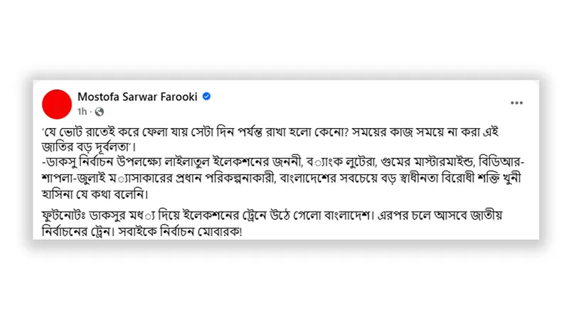 স্ট্যাটাসে তিনি লিখেছেন, “ডাকসুর মাধ্যমে ইলেকশনের ট্রেনে উঠে গেলো বাংলাদেশ। এরপর চলে আসবে জাতীয় নির্বাচনের ট্রেন। সবাইকে নির্বাচন মোবারক!”