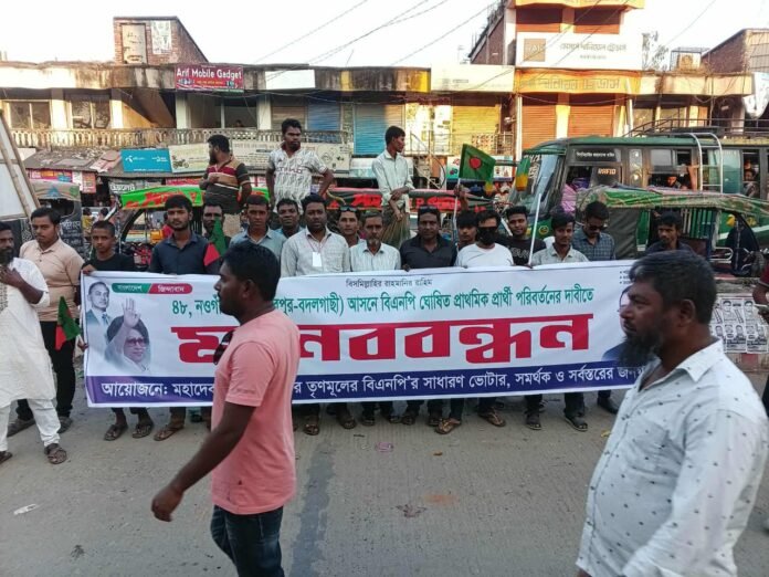 নওগাঁ-৩ (মহাদেবপুর–বদলগাছী) আসনে বিএনপির ঘোষিত প্রার্থী ফজলে হুদা বাবুলের মনোনয়ন পরিবর্তনের দাবিতে কয়েক হাজার নারী-পুরুষ প্রায় দুই কিলোমিটার দীর্ঘ মানববন্ধন ও প্রতিবাদ সমাবেশ করেছে। শনিবার (৮ নভেম্বর) বিকেল ৩টা থেকে মহাদেবপুর উপজেলা সদরের বাসস্ট্যান্ড এলাকায় এই কর্মসূচি পালিত হয়।