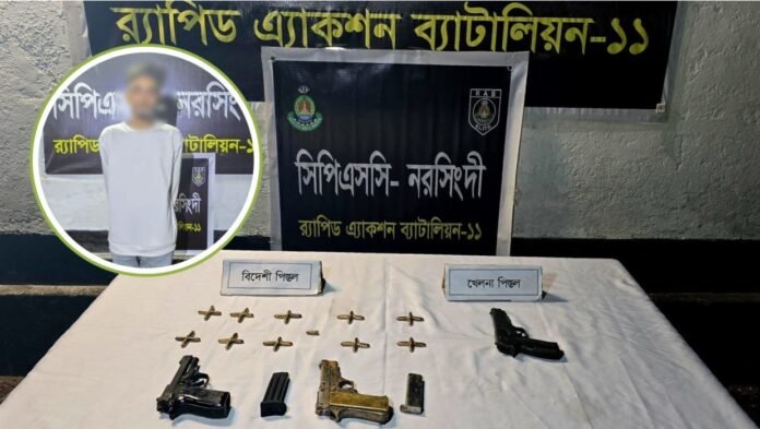 ইনকিলাব মঞ্চের মুখপাত্র শরিফ ওসমান হাদিকে গুলির ঘটনায় ব্যবহৃত অস্ত্র ও গোলাবারুদ উদ্ধার করেছে র্যাব। এ ঘটনায় মো. ফয়সাল (২৫) নামে এক ব্যক্তিকে আটক করা হয়েছে। ফয়সালের কাছ থেকে দুটি বিদেশি পিস্তল, দুটি ম্যাগাজিন, একটি খেলনা পিস্তল ও ৪১ রাউন্ড গোলাবারুদ উদ্ধার করা হয়। মঙ্গলবার (১৬ ডিসেম্বর) রাতে র্যাবের লিগ্যাল অ্যান্ড মিডিয়া উইংয়ের পরিচালক উইং কমান্ডার এম জেড এম ইন্তেখাব চৌধুরী এসব তথ্য জানান। তিনি বলেন, গোয়েন্দা তথ্যের ভিত্তিতে নরসিংদীর সদর থানাধীন তরুয়া এলাকাস্থ মোল্লার বাড়ির সামনে তরুয়ার বিলে পানির মধ্য থেকে অস্ত্র ও গোলাবারুদ উদ্ধার করা হয়েছে এবং এ ঘটনায় মো. ফয়সাল নামে এক ব্যক্তিকে আটক করা হয়েছে। এর আগে প্রধান আসামি ফয়সাল করিম মাসুদের বাবা মো. হুমায়ুন কবির (৭০) ও মা মোসা. হাসি বেগমকে (৬০) গ্রেপ্তার করে র্যাব। উল্লেখ্য, গত ১২ ডিসেম্বর শুক্রবার গণসংযোগের জন্য বিজয়নগর এলাকায় গেলে ওসমান হাদি হামলার শিকার হন। চলন্ত রিকশায় থাকা হাদিকে চলন্ত মোটরসাইকেলের পেছনে বসে থাকা এক আততায়ী গুলি করে, যা হাদির মাথায় লাগে।