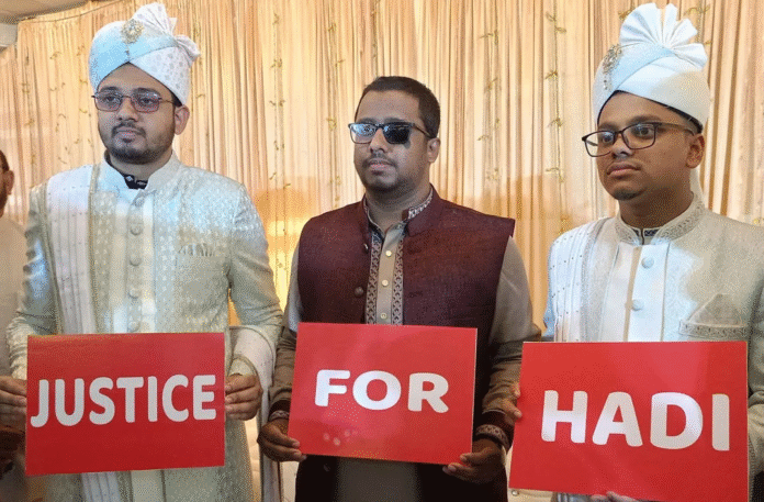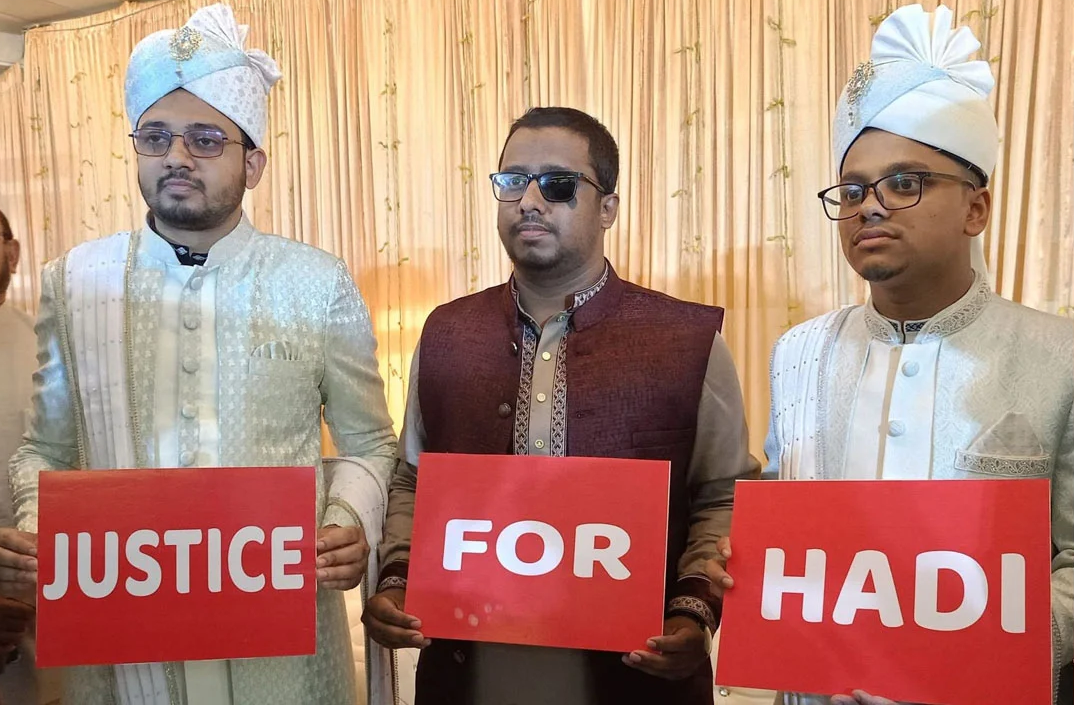 ঢাকা বিশ্ববিদ্যালয় কেন্দ্রীয় ছাত্র সংসদের (ডাকসু) সাধারণ সম্পাদক (জিএস) এসএম ফরহাদ ও এজিএস মহিউদ্দীন খান বিবাহবন্ধনে আবদ্ধ হয়েছেন। বিয়ের মঞ্চেই তারা ইনকিলাব মঞ্চের মুখপাত্র শরীফ ওসমান হাদি হত্যার বিচার দাবি করেন। এ ঘটনায় লেখক, অ্যাক্টিভিস্ট ও রাজনৈতিক বিশ্লেষক পিনাকী ভট্টাচার্য একটি ফটোকার্ড শেয়ার করে ফেসবুকে স্ট্যাটাস দিয়েছেন। পোস্ট করা ছবিতে দেখা যায়, বরের সাজে ফরহাদ ও মহিউদ্দীন ‘জাস্টিস ফর হাদি’ লেখা প্ল্যাকার্ড হাতে দাঁড়িয়ে আছেন। স্ট্যাটাসে পিনাকী ভট্টাচার্য লেখেন, ‘ডাকসুর জিএস ফরহাদ এবং এজিএস মহিউদ্দীনকে ধন্যবাদ। জীবনের গুরুত্বপূর্ণ দিনেও তারা শহীদ হাদিকে তাদের কর্মসূচিতে রেখেছে।’