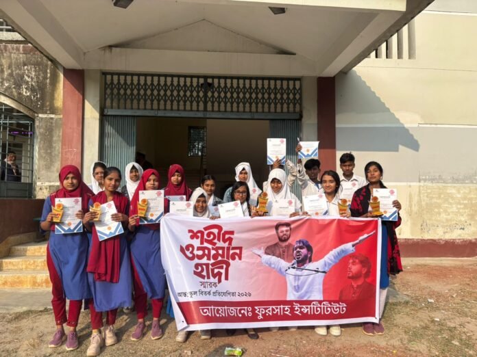 নওগাঁর বদলগাছীতে শহীদ ওসমান হাদীর স্মরণে দুই দিনব্যাপী আন্তঃস্কুল বিতর্ক প্রতিযোগিতা অনুষ্ঠিত হয়েছে। বদলগাছী থানাধীন বিটিএম বহুমুখী উচ্চ বিদ্যালয়ে এ প্রতিযোগিতার আয়োজন করে ফুরসাহ ইন্সটিটিউট। ‘শহীদ ওসমান হাদী স্মারক আন্তঃস্কুল বিতর্ক প্রতিযোগিতা–২০২৬’ শীর্ষক এই আয়োজনে বদলগাছী উপজেলার বিভিন্ন শিক্ষাপ্রতিষ্ঠানের আটটি দল অংশগ্রহণ করে।প্রতিযোগিতার চূড়ান্ত পর্ব শেষে গয়েশপুর সরকারি উচ্চ বিদ্যালয়ের দল চ্যাম্পিয়ন হওয়ার গৌরব অর্জন করে। রানার্সআপ হয় কদমগাছি উচ্চ বিদ্যালয়ের দল।সোমবার (২৬ জানুয়ারি) অনুষ্ঠিত সমাপনী অনুষ্ঠানে উদ্বোধনী বক্তব্য দেন বিটিএম বহুমুখী উচ্চ বিদ্যালয়ের প্রধান শিক্ষক দিলীপ কুমার দাস। অনুষ্ঠানে শুভেচ্ছা বক্তব্য রাখেন মাওলানা রফিকুল ইসলাম।অনুষ্ঠানে সভাপতিত্ব করেন ফুরসাহ ইন্সটিটিউটের প্রতিষ্ঠাতা রওশন আরা তাবাসসুম। বিতর্ক প্রতিযোগিতায় বিচারকের দায়িত্ব পালন করেন আরমান হোসেইন।আয়োজকরা জানান, শিক্ষার্থীদের যুক্তিবোধ ও বিশ্লেষণ ক্ষমতা বৃদ্ধির পাশাপাশি নেতৃত্বগুণ বিকাশে এ ধরনের শিক্ষামূলক আয়োজন গুরুত্বপূর্ণ ভূমিকা রাখবে।