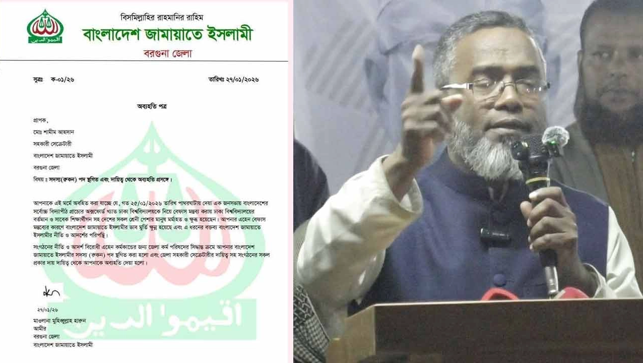 শামীম আহসানকে জামায়াতের সব পদ থেকে অব্যাহতি। বরগুনা জেলা জামায়াতে ইসলামীর যুগ্ম সাধারণ সম্পাদক শামীম আহসানকে দলের সব ধরনের দায়িত্ব থেকে অব্যাহতি দেওয়া হয়েছে। তার দলীয় সদস্য (রুকন) পদও স্থগিত করা হয়েছে। সেই সঙ্গে নির্বাচনের সব ধরনের দায়িত্ব থেকেও তাকে অব্যাহতি দেওয়া হয়েছে। জেলা জামায়াতের আমির মাওলানা মহিবুল্লাহ হারুনের সই করা এক বিজ্ঞপ্তিতে সোমবার এসব তথ্য জানানো হয়েছে। বরগুনা-২ (বামনা-পাথরঘাটা-বেতাগী) আসনে জামায়াতের প্রার্থীর পক্ষে নির্বাচনি প্রচারে শামীম আহসান ঢাকা বিশ্ববিদ্যালয়ের কেন্দ্রীয় ছাত্র সংসদ (ডাকসু) নিয়ে বিতর্কিত মন্তব্য করেন। গত শনিবার তিনি পাথরঘাটা উপজেলার কাটাখালীতে জামায়াতের প্রার্থী সুলতান আহমেদের নির্বাচনি জনসভায় বক্তব্য দেন। সেখানে তিনি বলেন, ‘আমরা দেখছি, ডাকসু নির্বাচনের পরে, যে ডাকসু মাদকের আড্ডা ছিল, যে ডাকসু বেশ্যাখানা ছিল, সেটা ইসলামী ছাত্রশিবির পরিবর্তন করতে সক্ষম হয়েছে। তাই এই বাংলাদেশ থেকে সকল প্রকার অন্যায়, সকল প্রকার চাঁদাবাজ, সকল প্রকার দুর্নীতি উৎখাত করতে জামায়াতে ইসলামী সক্ষম।’ ওই বক্তব্য সামাজিক যোগাযোগমাধ্যমে ছড়িয়ে পড়লে সারা দেশে সমালোচনা ও ক্ষোভের সৃষ্টি হয়। শামীম আহসানকে অব্যাহতি দেওয়া বিজ্ঞপ্তিতে বলা হয়, সম্প্রতি এক জনসভায় ঢাকা বিশ্ববিদ্যালয়কে নিয়ে শামীম আহসান বেফাঁস মন্তব্য করেন। এতে ঢাকা বিশ্ববিদ্যালয়ের বর্তমান ও সাবেক শিক্ষার্থীসহ দেশের বিভিন্ন শ্রেণি-পেশার মানুষ মর্মাহত ও ক্ষুব্ধ হয়েছেন। তাঁর ওই বক্তব্যে বাংলাদেশ জামায়াতে ইসলামীর ভাবমূর্তি ক্ষুণ্ন হয়েছে এবং এটি দলটির নীতি ও আদর্শের পরিপন্থি। এ কারণে জেলা কর্মপরিষদের সিদ্ধান্ত অনুযায়ী শামীম আহসানের রুকন পদ স্থগিত করা হলো এবং সংগঠনের সব ধরনের দায়িত্ব থেকে তাঁকে অব্যাহতি দেওয়া হয়েছে। বিষয়টি নিশ্চিত করে বরগুনা জেলা জামায়াতের আমির মাওলানা মহিবুল্যাহ হারুন আমার দেশকে বলেন, গত ২৫ জানুয়ারি বরগুনা-২ আসনে জামায়াতের একটি নির্বাচনি পথসভায় জেলা জামায়াতের যুগ্ম সাধারণ সম্পাদক মো. শামীম আহসান ঢাকা বিশ্ববিদ্যাল নিয়ে কিছু বিরূপ মন্তব্য করেন। এটি অশোভন ও অনাকাঙ্ক্ষিত। তার এমন বক্তব্যের কারণে তাকে দল থেকে অব্যাহতি দেওয়া হয়েছে।