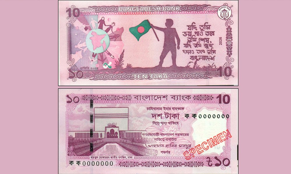 আগামীকাল মঙ্গলবার নতুন নকশার এ নোট বাজারে ছাড়া হবে। নতুন ১০ টাকার নোটটি প্রথমে বাংলাদেশ ব্যাংকের মতিঝিল অফিস থেকে এবং পরবর্তীতে কেন্দ্রীয় ব্যাংকের অন্যান্য অফিস থেকে ছাড়া হবে। সোমবার বাংলাদেশ ব্যাংকের এক সংবাদ বিজ্ঞপ্তিতে এ তথ্য জানানো হয়েছে। কেন্দ্রীয় ব্যাংকের গভর্নর ড. আহসান এইচ মনসুরের স্বাক্ষরযুক্ত ১০ টাকা মূল্যমানের ব্যাংক নোটটির আকার নির্ধারণ করা হয়েছে ১২৩ মিমি × ৬০ মিমি। নোটে জলছাপ হিসেবে রয়েল বেঙ্গল টাইগারের মুখ ব্যবহার করা হয়েছে। নোটটিতে গোলাপি রঙের আধিক্য রয়েছে। বাংলাদেশ ব্যাংক জানিয়েছে, নোটের সম্মুখভাগের বাম পাশে বায়তুল মোকাররম জাতীয় মসজিদের ছবি মুদ্রিত রয়েছে। মাঝখানে ব্যাকগ্রাউন্ডে পাতা ও কলিসহ প্রস্ফুটিত জাতীয় ফুল শাপলার নকশা শোভা পাচ্ছে। নোটের পেছনভাগে ‘গ্রাফিতি–২০২৪’-এর ছবি মুদ্রিত রয়েছে। নোটের সম্মুখভাগের বাম পাশে ২ মি.মি. চওড়া একটি নিরাপত্তা সুতা সংযোজন করা হয়েছে, যাতে ‘১০ টাকা’ লেখা রয়েছে, যা আলোর বিপরীতে ধরলে দৃশ্যমান হবে। নোটটি নাড়াচাড়া করলে নিরাপত্তা সুতার রং লাল থেকে সবুজে পরিবর্তিত হয়। নোটটিতে গভর্নর স্বাক্ষরের ডান পাশে একটি See-through image হিসেবে একটি প্যাটার্ন মুদ্রিত রয়েছে, যা আলোর বিপরীতে ধরলে ‘১০’ লেখা দৃশ্যমান হয়। এছাড়া নোটের সম্মুখভাগের উপরে ‘বাংলাদেশ ব্যাংক’ লেখার নিচে সমান্তরালভাবে এবং পেছনভাগের বাম দিকের গ্লিউইশ প্যাটার্নের বাইরের অংশে Microprint হিসেবে ‘BANGLADESH BANK’ মুদ্রিত রয়েছে। নতুন ডিজাইন ও বৈশিষ্ট্যের ১০ টাকা মূল্যমানের নোটের পাশাপাশি বর্তমানে প্রচলিত সব কাগুজে নোট ও ধাতব মুদ্রাও যথারীতি চালু থাকবে। এছাড়া মুদ্রা সংগ্রাহকদের চাহিদা বিবেচনায় নিয়মিত নোটের পাশাপাশি ১০ টাকা মূল্যমানের নমুনা নোট (যা বিনিময়যোগ্য নয়) মুদ্রণ করা হয়েছে, যা টাকা জাদুঘর থেকে নির্ধারিত মূল্যে সংগ্রহ করা যাবে।