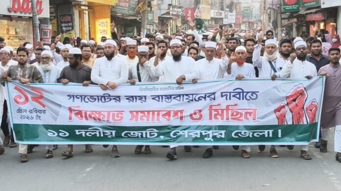 গণভোটের রায় ও জুলাই সনদ দ্রুত বাস্তবায়নের দাবিতে শেরপুরে বিক্ষোভ সমাবেশ ও মিছিল করেছে ১১ দলীয় জোট। জেলা শহরে আয়োজিত এই কর্মসূচিতে বিভিন্ন রাজনৈতিক ও সামাজিক সংগঠনের নেতাকর্মীরা অংশগ্রহণ করেন।